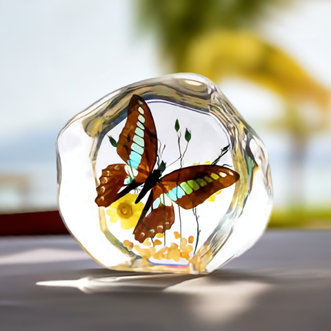 This elegant desktop paperweight features a real butterfly, ethically sourced and carefully preserved in crystal-clear resin. Every detail of the butterfly’s vibrant wings and delicate form is captured, transforming it into a stunning piece of nature-inspired art.